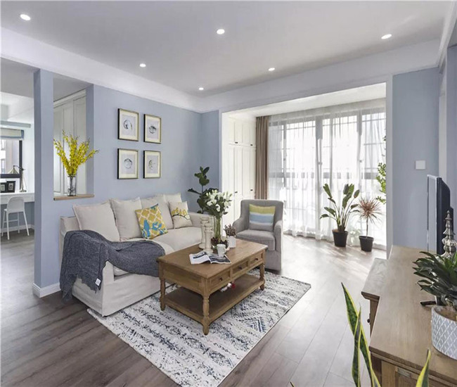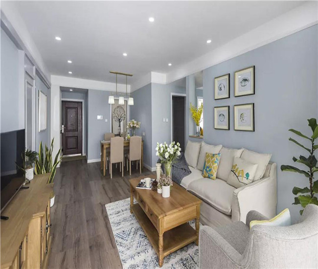 【设计说明】本案例是城央一品113平米美式风格的三居室,客厅整体以淡蓝色为基调,搭配复古质感的木质家具与地板,整体舒适雅致不失自然惬意。