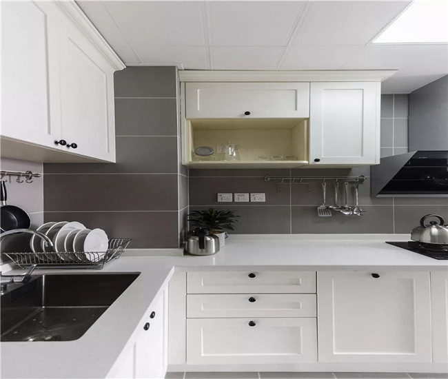 厨房墙面设置挂杆,让厨具有个便于取放的收纳之处,灰色基调搭配白色的橱柜,让烹饪氛围简约又轻松。