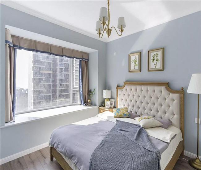主卧以蓝色和白色为主调,柔和而雅致。飘窗不仅增加了收纳功能,也是看看书或者发发呆的惬意去处。