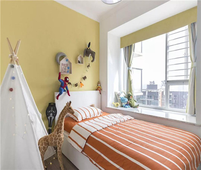 儿童房以充满活力感的黄色为主调,靠窗摆放的儿童床搭配橙色条纹床品,背景墙挂上可爱的小墙饰,还有地上软萌的帐篷,使空间充满了童趣感。