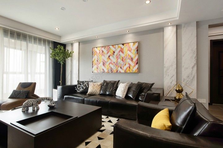 详情滟澜山131平现代风格客厅真皮沙发装修图片