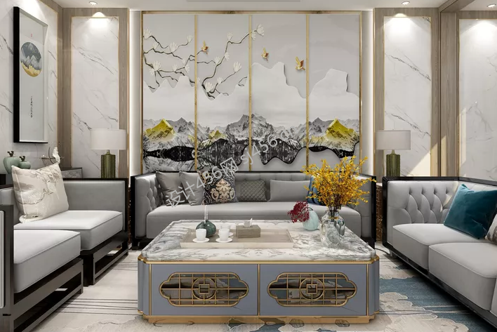 中式风格130平米三居室客厅沙发背景墙装饰装修效果图