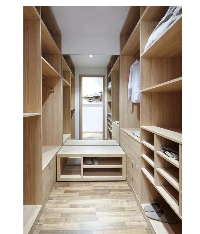 由卫浴改成的衣帽间,在制作柜子时要注意选择板材,因为保持干爽,挡住潮湿是非常关键的。卫浴间的吊顶材料有很多种类,如果改成衣帽间使用,吊顶尽量使用有微孔的铝扣板,能起到通风和预防冷凝的作用。如果觉得铝扣板不够美观,选用石膏板做吊顶的话,一定要注意选择防水的石膏板,并涂刷防水乳胶漆。