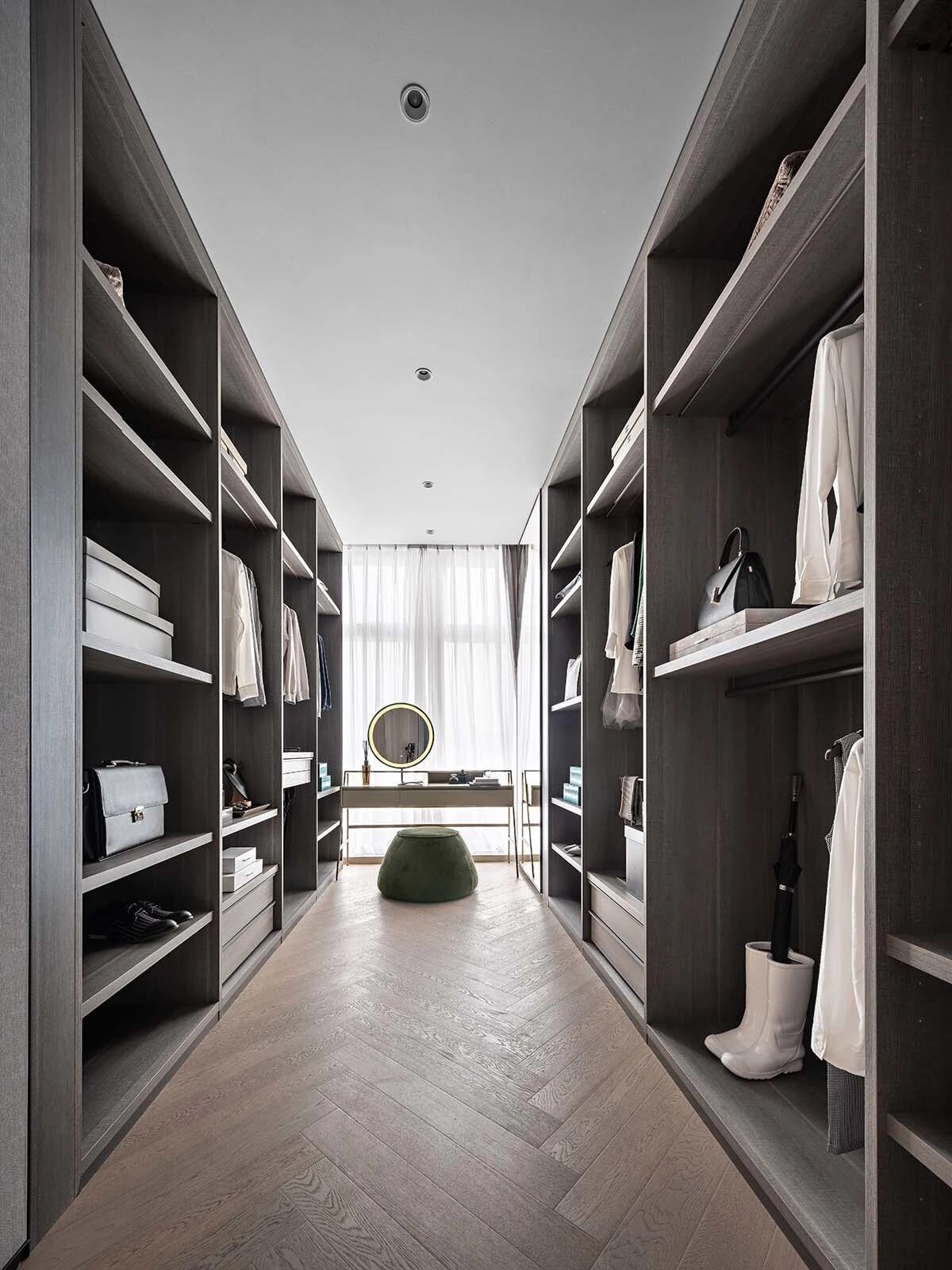 也就是单排衣帽间的升级组合,由两个大大的衣柜两边设计而成,衣柜的中间还可以放上梳妆台和梳妆镜,空间的利用率更高。
