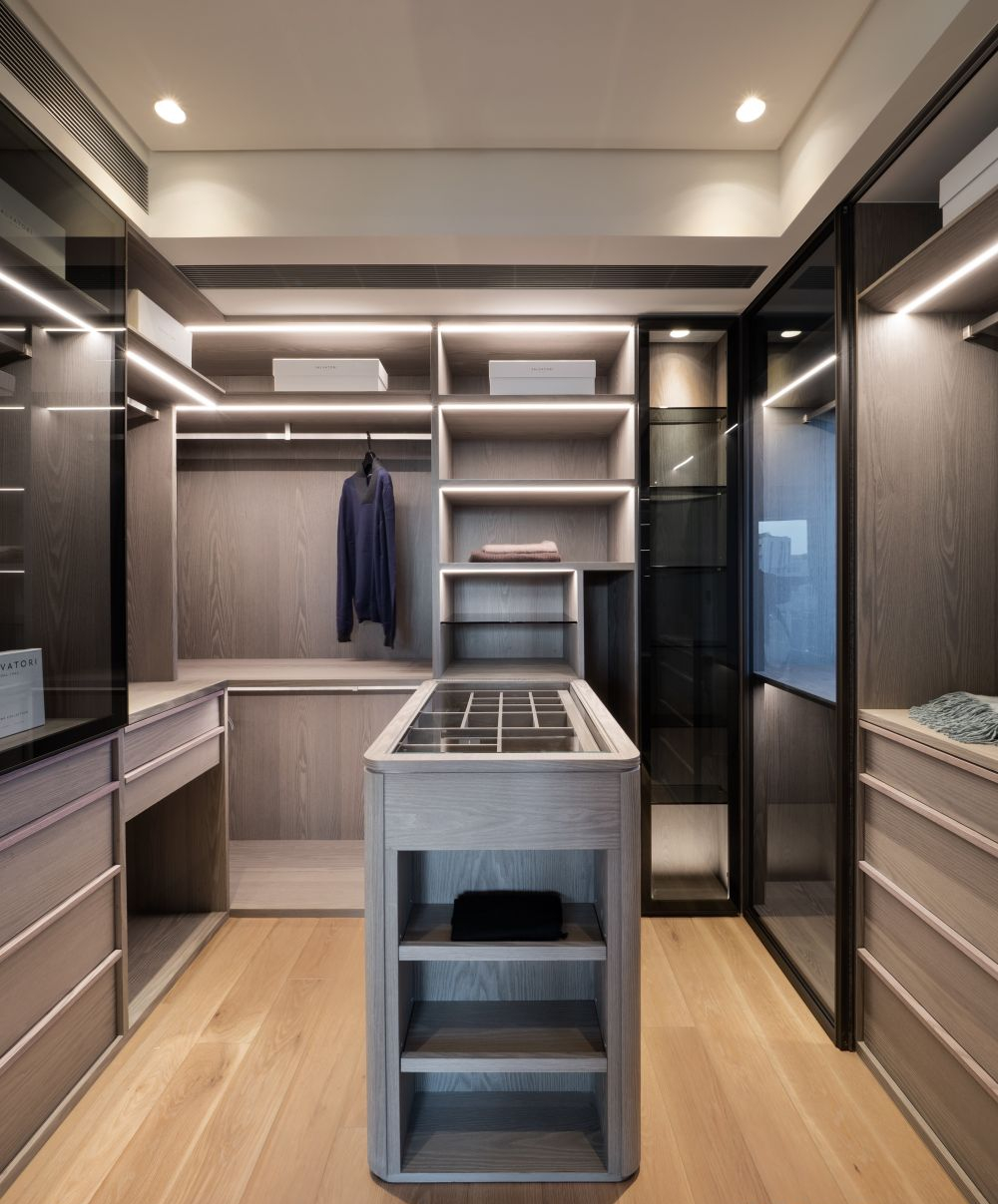 是独立式衣帽间的一种,在衣柜的中央加上中岛设计,可以将一些细小而精致的首饰放在里面,方便挑选。