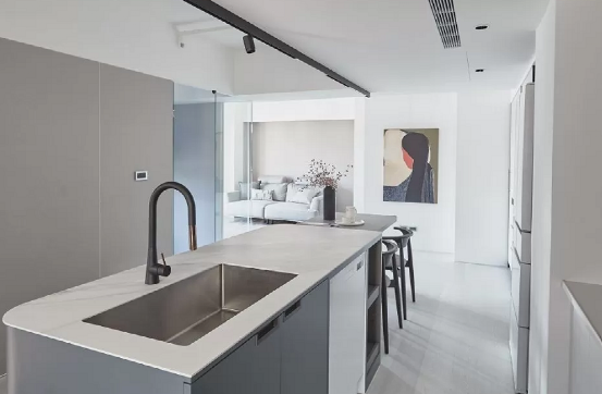 台下盆非常好打理,台面上的水、饭渣、菜叶轻轻一抹就到水盆里了;而且整体看去和台面融为一体简洁、美观、大方。