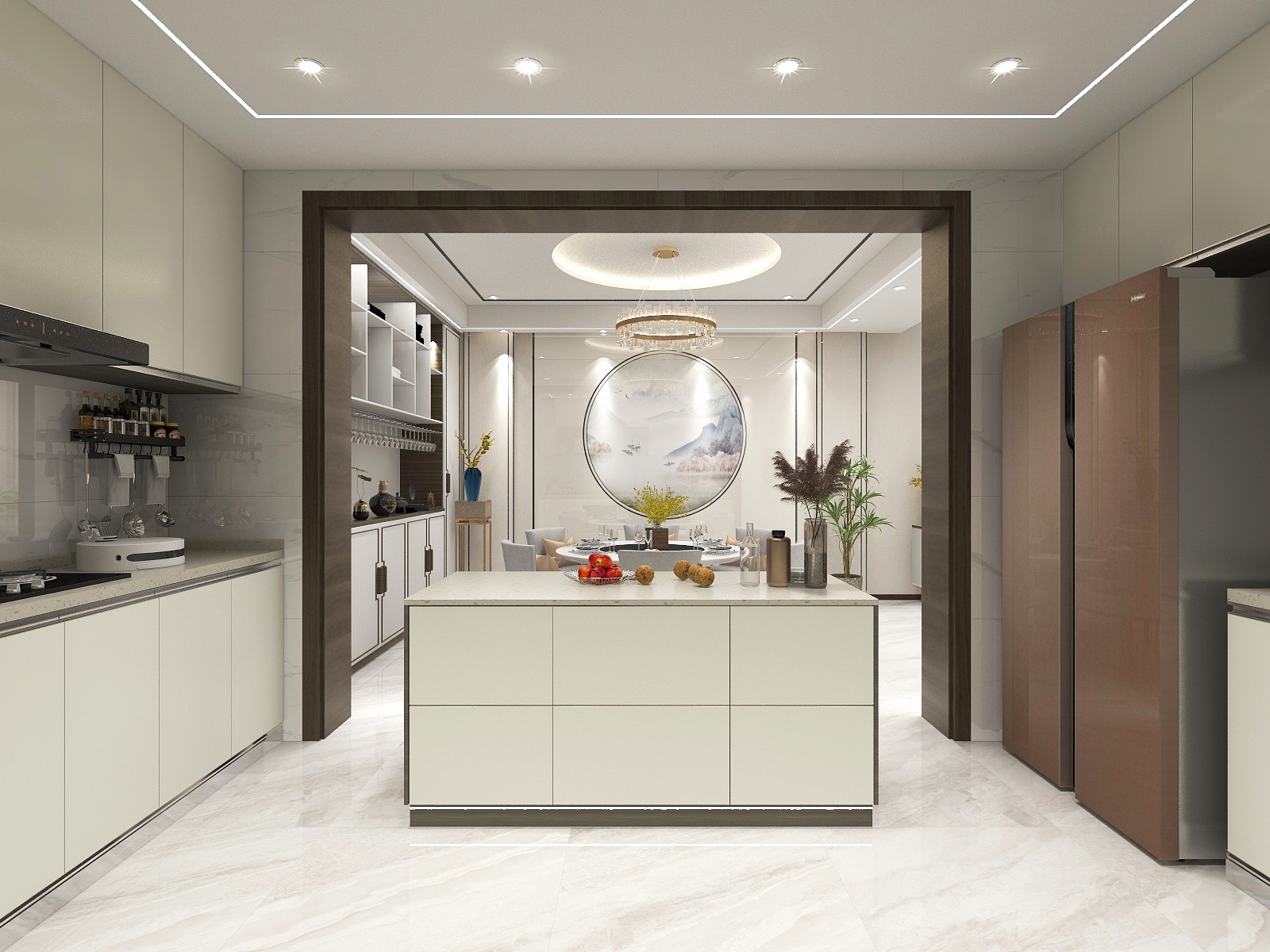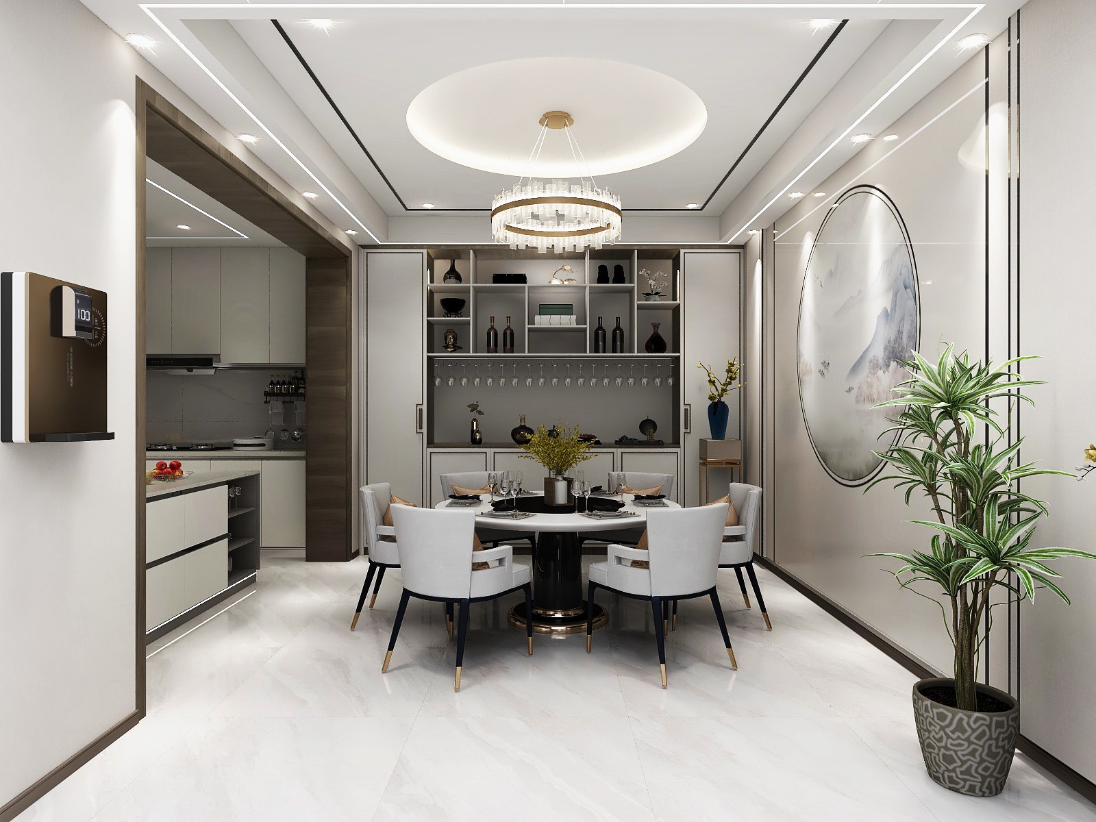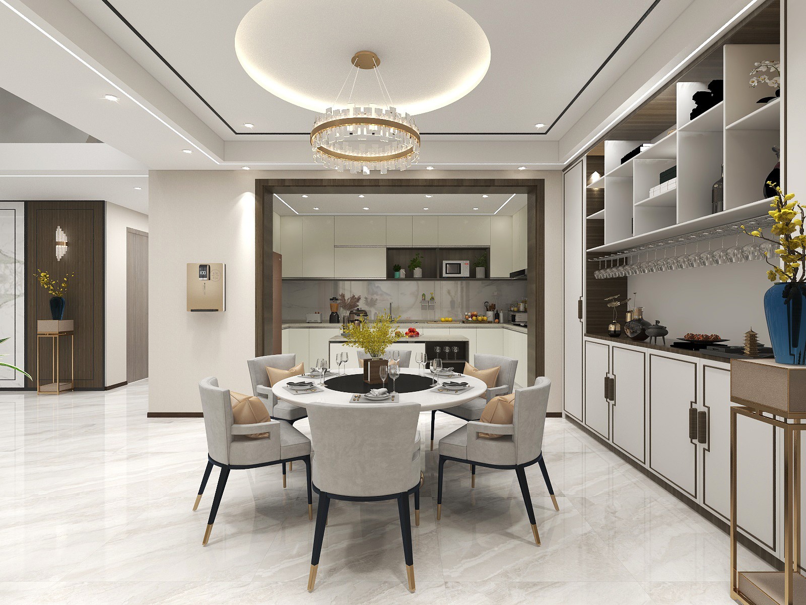通过厨房和客餐厅进行区域的划分,简约的大理石餐桌搭配简洁的灰色餐椅给人一种时尚的感觉,设计精巧的吊灯悬吊在餐桌上方。