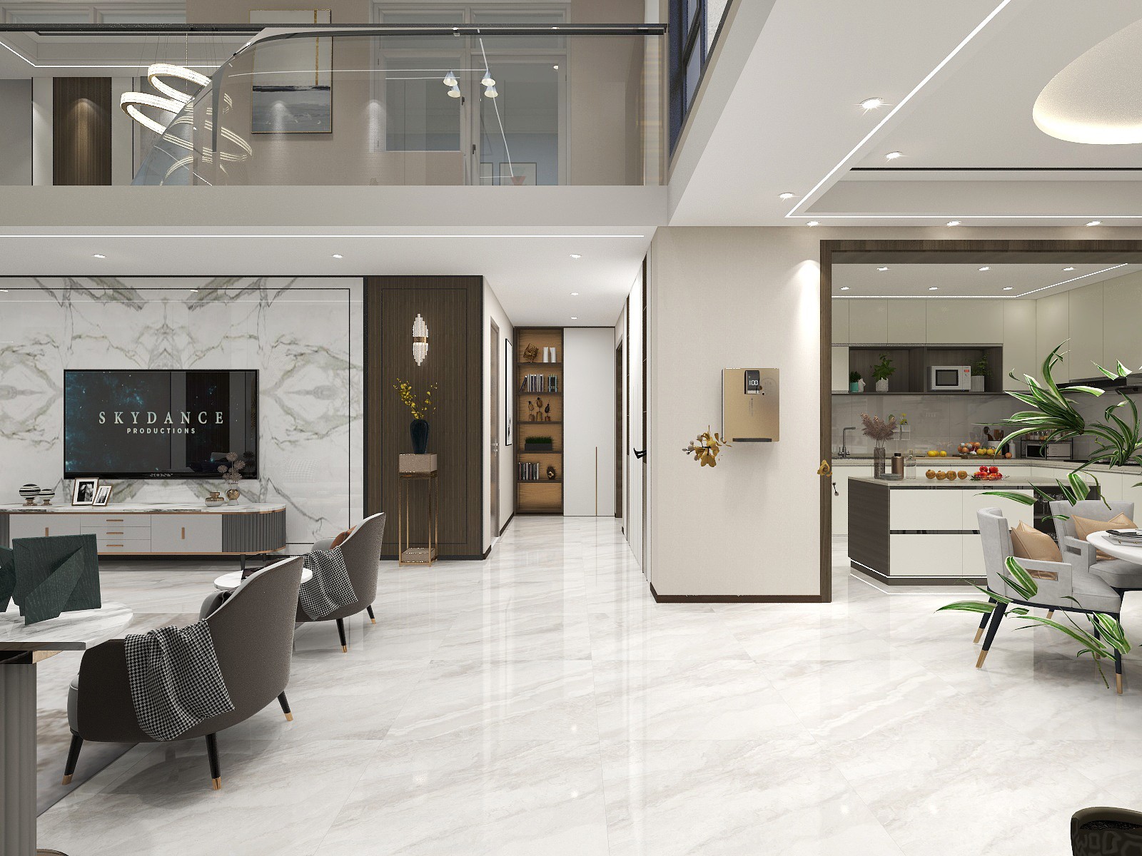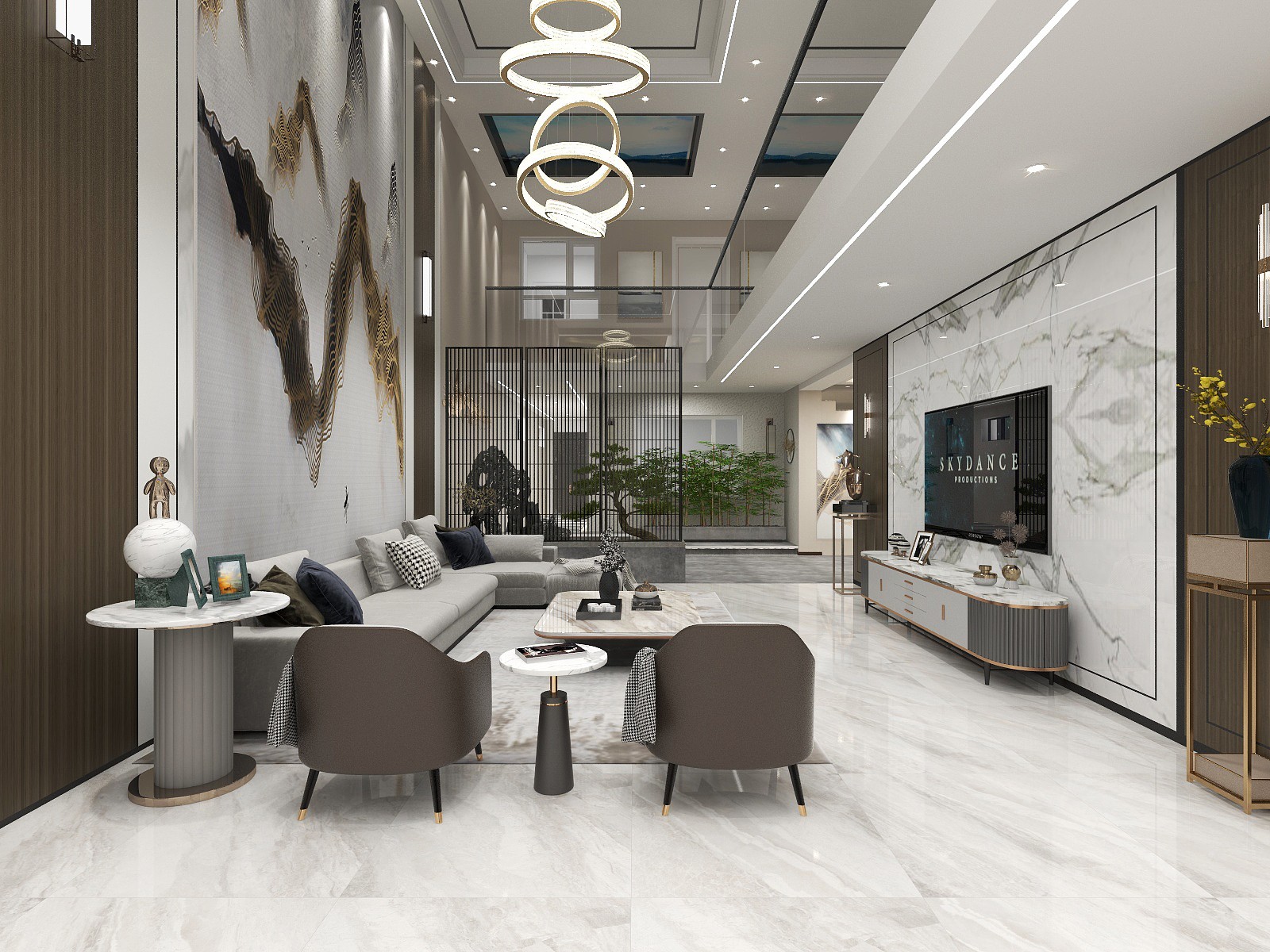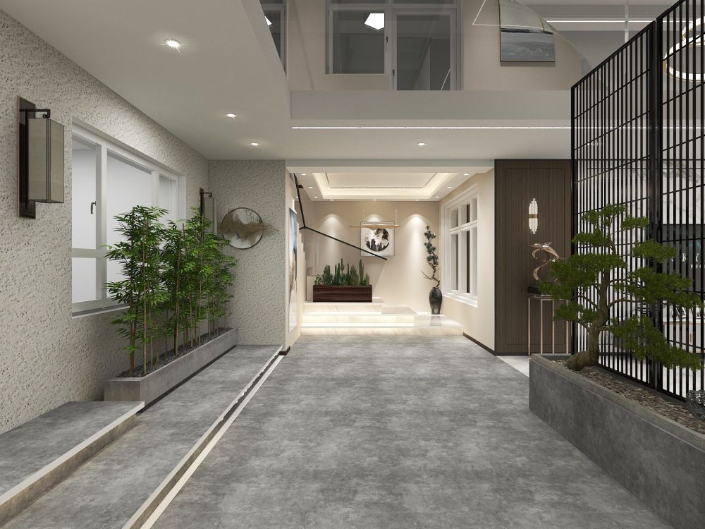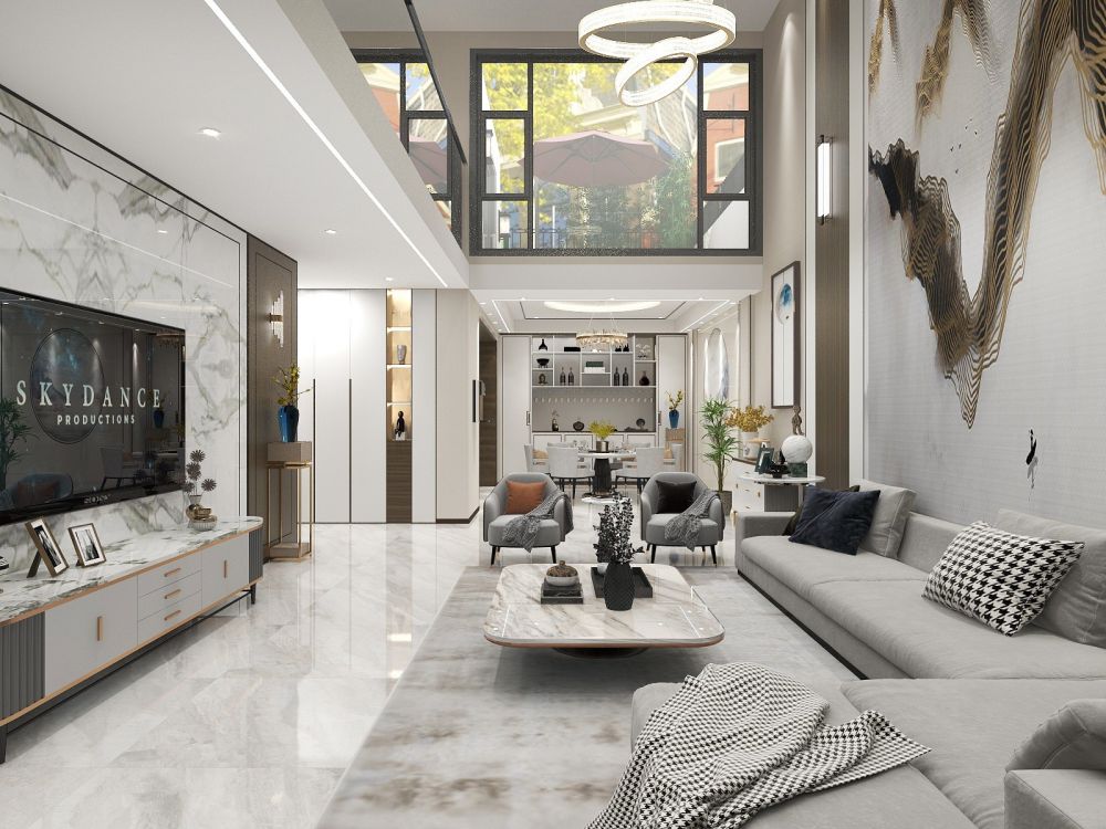 挑高的设计让整个空间恢弘大气,设计师充分利用户型和室外的光影,结合园林屏风的元素构建, 营造出一处宜赏宜居的公共空间。