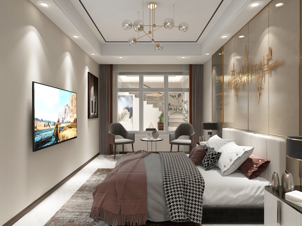 主卧时尚空间线条简洁,高级灰+烟粉色的轻熟风,自带滤镜的优雅,让空间更有层次感。