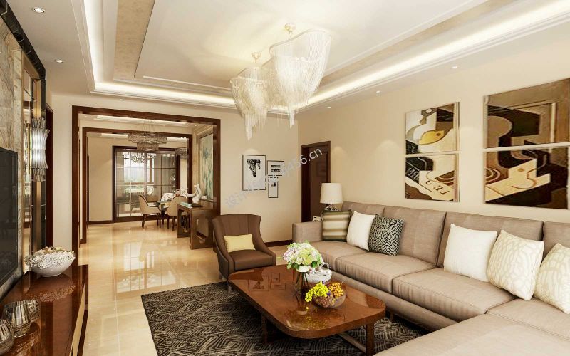 设计理念: 整个客厅为暖色调,以咖色和米白色为主,电视背景墙为整块的大理石面两面是镜面的造型与地砖相搭配更显明亮,沙发背景墙是几幅有艺术气息的画与浅咖色的布艺沙发相搭配还有一丝丝的文艺范。餐厅没有过多的修饰,以简约为主,唯一的的特点是吊灯,略带写古典的气息。我们在设计房屋过道的时候,要注重因墙制宜。可以将与过道相连接的墙面做成装饰墙,然后在添加一个展架,可以在上面摆放工艺品,使得整个过道显得不那么沉闷,更加有灵动感。另外,工艺品的选择还可以彰显业主的审美感知能力与独特的品味,呈现出良好的视觉效果。 整个客厅为暖色调,以咖色和米白色为主,电视背景墙为整块的大理石面两面是镜面的造型与地砖相搭配更显明亮,沙发背景墙是几幅有艺术气息的画与浅咖色的布艺沙发相搭配还有一丝丝的文艺范。餐厅没有过多的修饰,以简约为主,唯一的的特点是吊灯,略带写古典的气息。我们在设计房屋过道的时候,要注重因墙制宜。可以将与过道相连接的墙面做成装饰墙,然后在添加一个展架,可以在上面摆放工艺品,使得整个过道显得不那么沉闷,更加有灵动感。另外,工艺品的选择还可以彰显业主的审美感知能力与独特的品味,呈现出良好的视觉效果。