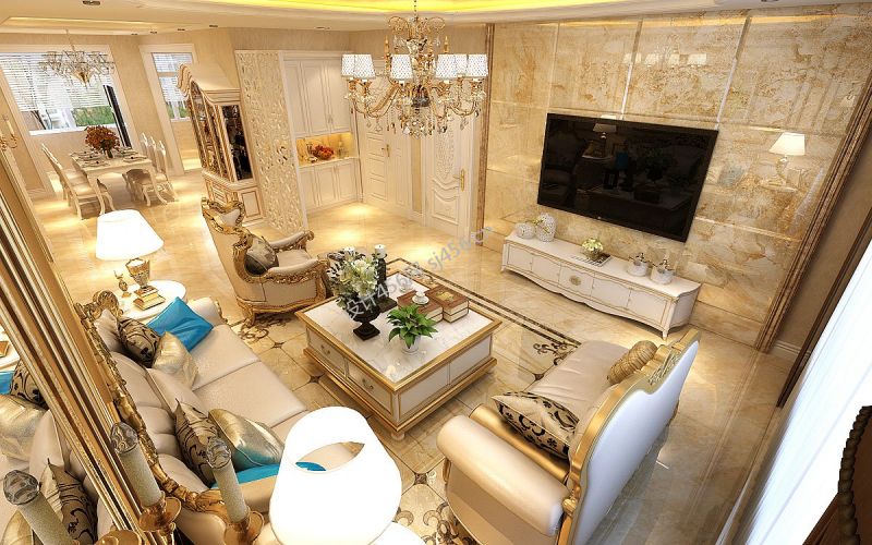 设计理念: 整个客厅看上去有种金碧辉煌,富丽堂皇之感,特色的吊顶搭配奢华的吊灯充满了华丽,纯欧式的沙发大气非凡,背景墙上放置对称的烛台式的壁灯。电视背景墙为大理石面与地砖相辅相成。窗帘采用褐色的颜色给耀眼的金色中填一丝沉稳。餐厅欧式的餐桌椅,搭配水晶灯时尚大气,厨房为金色的墙面搭配白色的橱柜,干净明亮。主卧室,欧式花纹的壁纸搭配欧式的公主床,浅色系整洁温馨,深色的窗帘遮光性强又带给空间沉稳之感。粉嫩的公主房,整个空间的墙面为淡粉色,窗帘和床采用更深一层的莫兰迪粉,不耀眼却有少女的粉嫩感。 整个客厅看上去有种金碧辉煌,富丽堂皇之感,特色的吊顶搭配奢华的吊灯充满了华丽,纯欧式的沙发大气非凡,背景墙上放置对称的烛台式的壁灯。电视背景墙为大理石面与地砖相辅相成。窗帘采用褐色的颜色给耀眼的金色中填一丝沉稳。餐厅欧式的餐桌椅,搭配水晶灯时尚大气,厨房为金色的墙面搭配白色的橱柜,干净明亮。主卧室,欧式花纹的壁纸搭配欧式的公主床,浅色系整洁温馨,深色的窗帘遮光性强又带给空间沉稳之感。粉嫩的公主房,整个空间的墙面为淡粉色,窗帘和床采用更深一层的莫兰迪粉,不耀眼却有少女的粉嫩感。