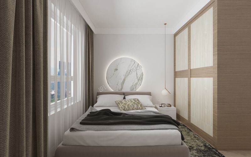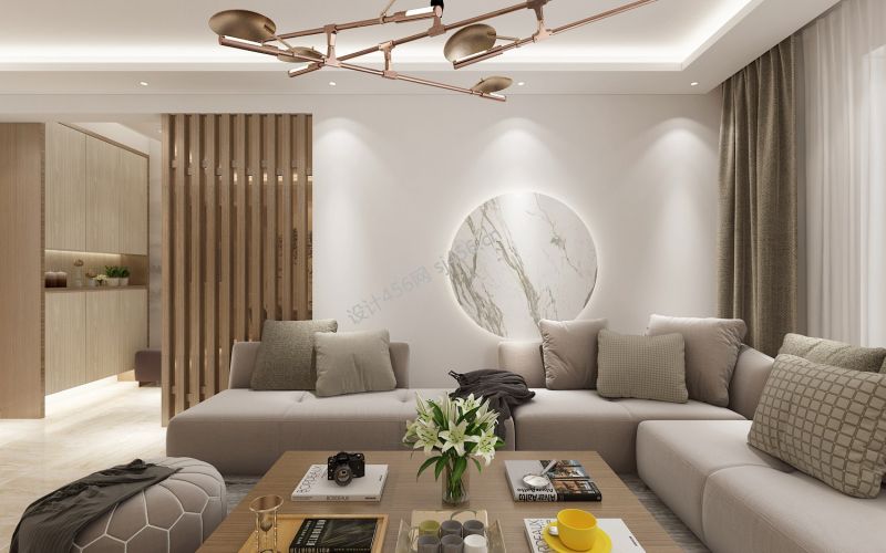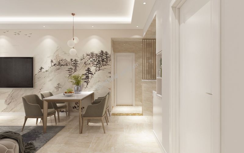 设计理念: 本案为现代中式风格,没有过多的色彩,整体都采用白色、麻灰色、原木色来搭配,这样的纯色搭配在一起反而有种纯净之美。沙发背景为纯净的白墙搭配一个圆形切割的大理石面,大理石特意选择类似水墨一样的花纹,搭配灰色的沙发、麻灰色的窗帘别有一番风味。电视位置与餐厅处于同一空间没有明确的划分,让小的空间没有局限性,餐厅与电视共用一个背景墙,一幅山水的水墨画很有意境。玄关处,一个暗红色的沙发凳搭配烟墨之美的水墨画。书房处大量采用原木色与白色的搭配,榻榻米的设计既可以休息也可以当做客房。 本案为现代中式风格,没有过多的色彩,整体都采用白色、麻灰色、原木色来搭配,这样的纯色搭配在一起反而有种纯净之美。沙发背景为纯净的白墙搭配一个圆形切割的大理石面,大理石特意选择类似水墨一样的花纹,搭配灰色的沙发、麻灰色的窗帘别有一番风味。电视位置与餐厅处于同一空间没有明确的划分,让小的空间没有局限性,餐厅与电视共用一个背景墙,一幅山水的水墨画很有意境。玄关处,一个暗红色的沙发凳搭配烟墨之美的水墨画。书房处大量采用原木色与白色的搭配,榻榻米的设计既可以休息也可以当做客房。