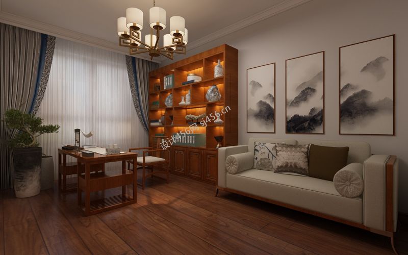 设计理念: 中式风格的特点主要就是庄重与优雅,本案以浅色的地砖白色的墙面搭配棕红色的实木家具,在以优雅的墨蓝色点缀其中。客厅以镂空的电视背景墙为界线隔出一个小茶室整个空间显出书香之气,小茶室靠墙位置设计出一个书柜同时有着很多大储物空间餐厅,棕红色的餐桌椅搭配蓝色的坐垫有庄重之感,背景墙梅花的水墨画很具有中国特色的美。书房,中式特色的装饰给以庄重大气之感。 中式风格的特点主要就是庄重与优雅,本案以浅色的地砖白色的墙面搭配棕红色的实木家具,在以优雅的墨蓝色点缀其中。客厅以镂空的电视背景墙为界线隔出一个小茶室整个空间显出书香之气,小茶室靠墙位置设计出一个书柜同时有着很多大储物空间餐厅,棕红色的餐桌椅搭配蓝色的坐垫有庄重之感,背景墙梅花的水墨画很具有中国特色的美。书房,中式特色的装饰给以庄重大气之感。
