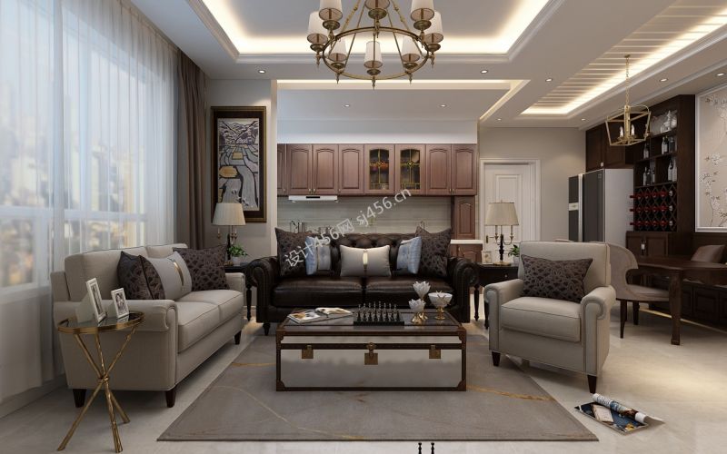设计理念: 本案简美式风格,深浅两色搭配的沙发舒适大气,加上一个复古的茶几与咖色的电视柜,深色的家具搭配浅色的电视背景墙不显空间沉闷。沙发的背后设计为开放式厨房,L型的橱柜设计,咖色与白色相结合的厨房大气干净。主卧室,同样深浅色搭配,咖色的衣柜和床搭配浅色的墙面地板,大气还摆脱沉闷感。次卧,儿童房一扫复古之感,采用白色的衣柜与座椅,蓝色的壁纸,卡通的床饰展现儿童的活泼。 本案简美式风格,深浅两色搭配的沙发舒适大气,加上一个复古的茶几与咖色的电视柜,深色的家具搭配浅色的电视背景墙不显空间沉闷。沙发的背后设计为开放式厨房,L型的橱柜设计,咖色与白色相结合的厨房大气干净。主卧室,同样深浅色搭配,咖色的衣柜和床搭配浅色的墙面地板,大气还摆脱沉闷感。次卧,儿童房一扫复古之感,采用白色的衣柜与座椅,蓝色的壁纸,卡通的床饰展现儿童的活泼。