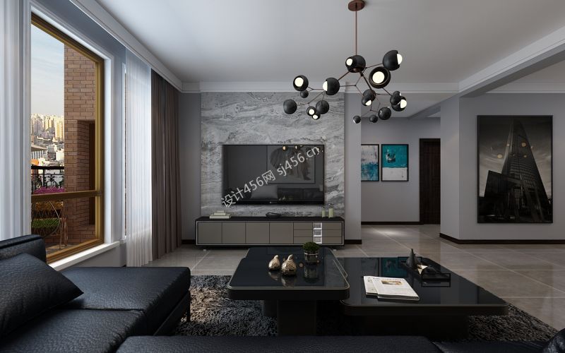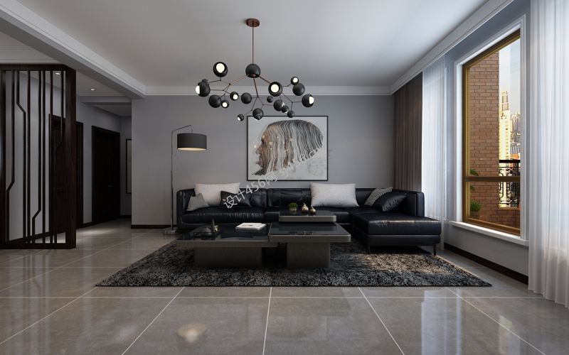 设计理念: 本案为现代风格,哈尔滨鸣雀装饰设计师采用当下流行的黑白色进行搭配,没有过于艳丽的色彩却沉稳大气,黑色的皮质沙发质感非凡,室内灰色的墙面搭配大理石材质的电视背景墙更显时尚,落地窗的设计在深色的空间里增添明亮。 本案为现代风格,哈尔滨鸣雀装饰设计师采用当下流行的黑白色进行搭配,没有过于艳丽的色彩却沉稳大气,黑色的皮质沙发质感非凡,室内灰色的墙面搭配大理石材质的电视背景墙更显时尚,落地窗的设计在深色的空间里增添明亮。