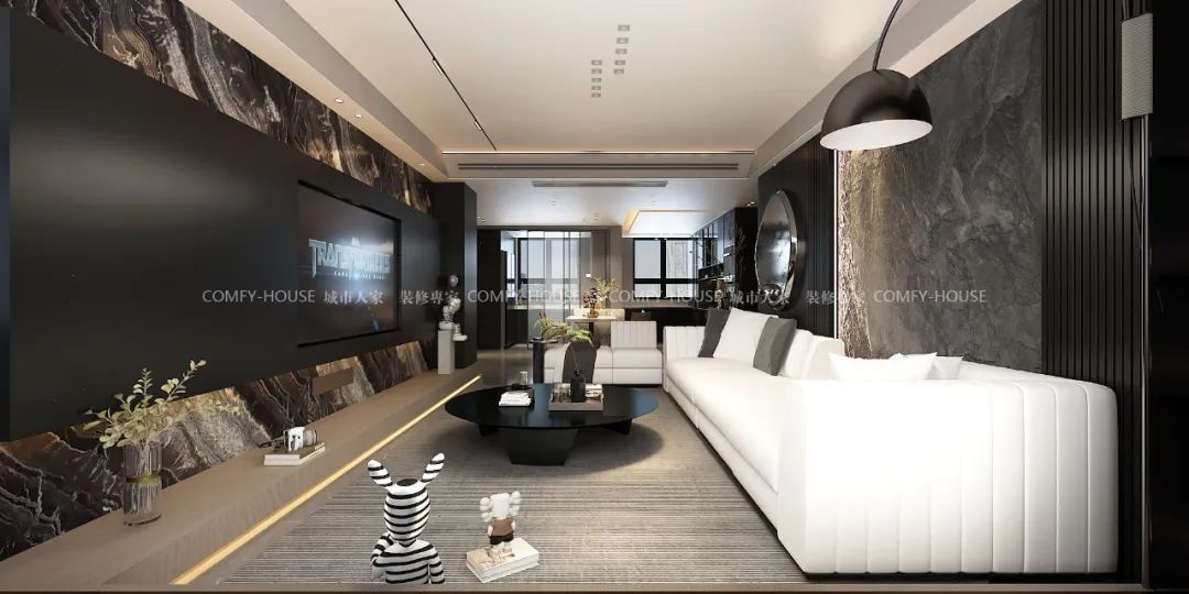 深灰色质感的地砖、浅灰色的家居软装内敛低调白色沙发和镜面装饰则点亮空间给家带来更多温暖与色彩