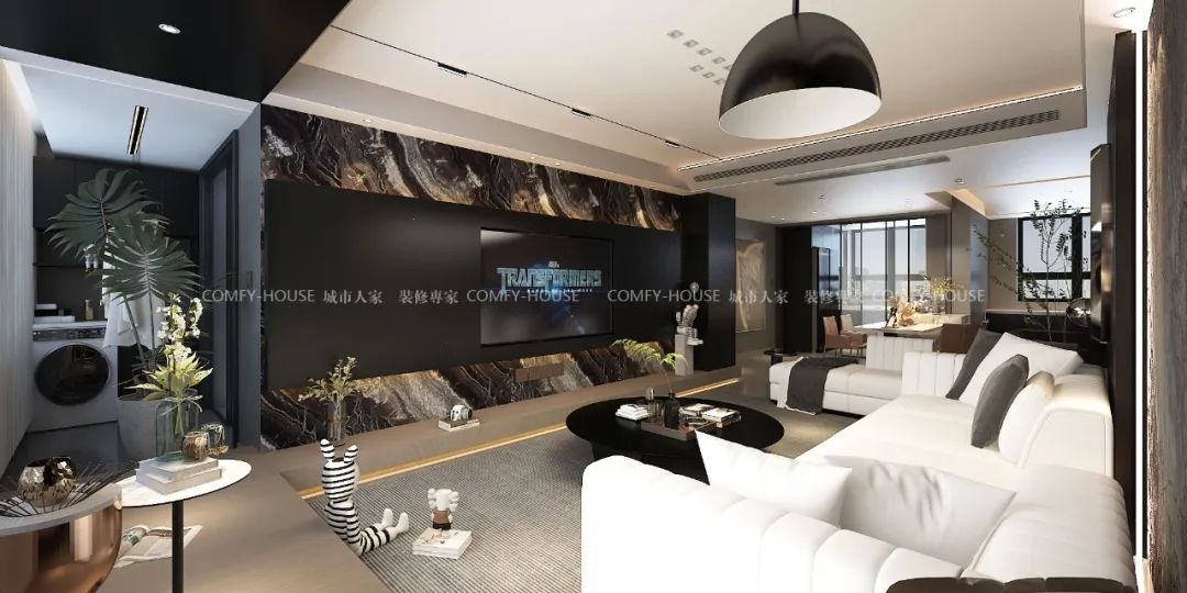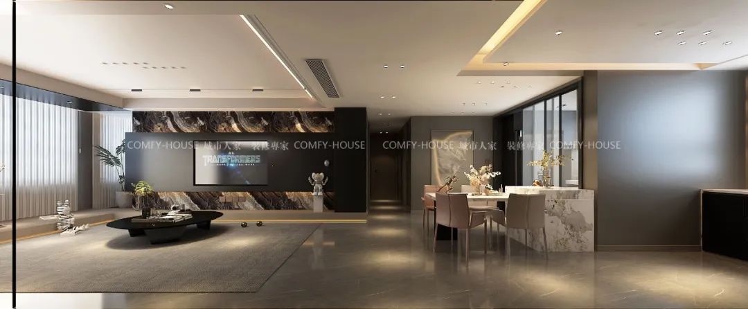 餐桌与白色纹理大理石岛台相结合营造氛围开放式的布局整个客餐厅毫无阻隔空间与空间联通
