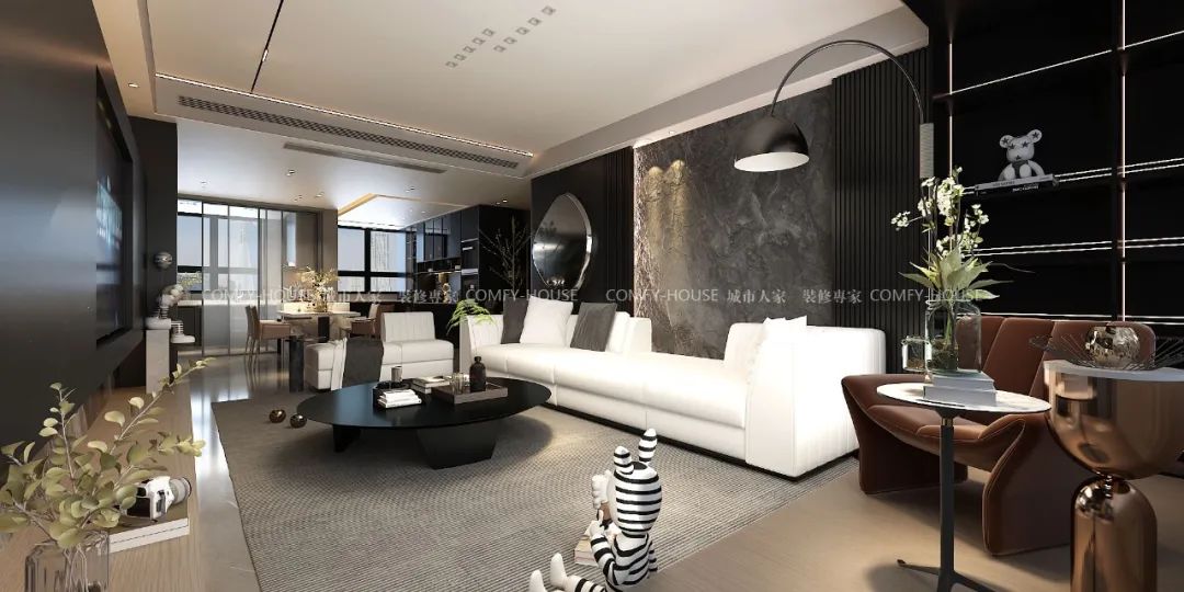 冷冽的质感与皮质的柔软细腻相互平衡材质的碰撞与融合丰富空间层次