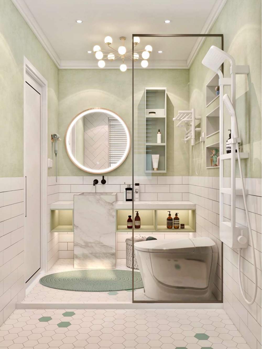 倘若在洗手池台面上摆放各种化妆用品的话,会显得非常凌乱,不仅影响美观,而且还容易碰倒。因此,不妨在洗手池上方的墙面上安装几层隔板或打造嵌入式的柜体,既可以节省空间,又可以增强卫生间的收纳能力,一举两得。另外,还有马桶冲水槽的上方空间也可以合理利用起来,比如打造吊柜,用来放置纸巾、洗洁剂等用品都是非常方便的。