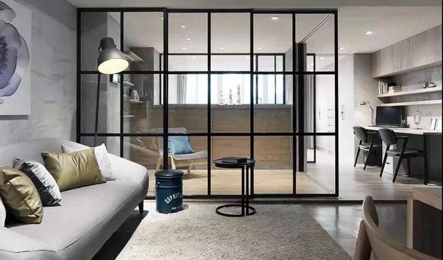 时下流行的隔断形式有很多,黑框玻璃门是非常理想的功能分区的办法。它时尚、精致、“隔而不断”,而且会让整个空间都有明亮通透的感觉。