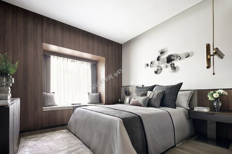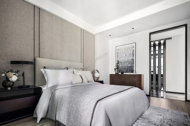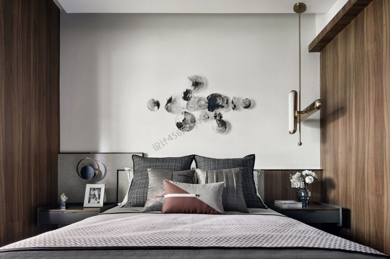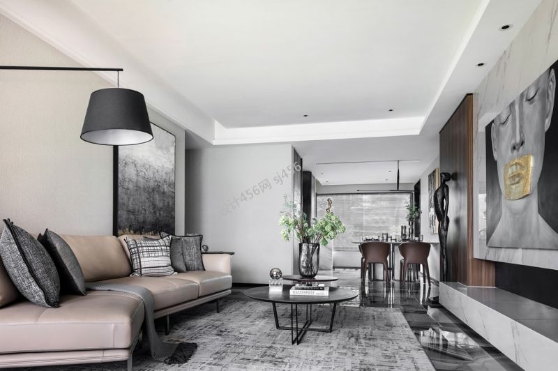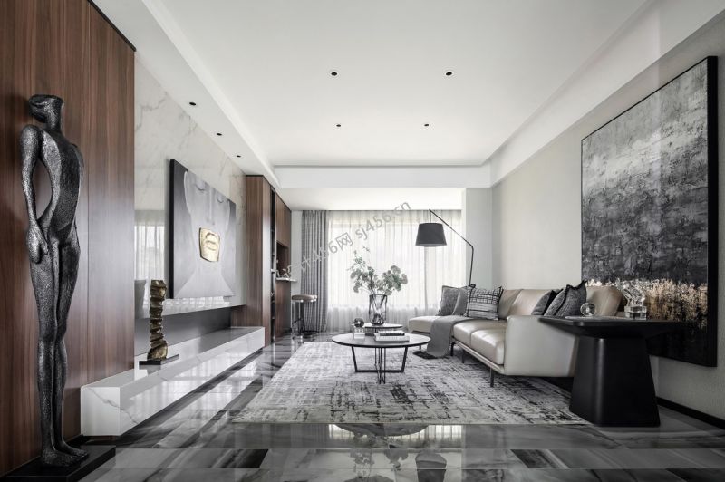 设计理念: 整体空间以黑白灰的品质感为基底,加以温润的胡桃木形成空间调性的延展。在黑白的沉稳中,大块细腻温暖的胡桃木,让人想起日落时静谧、美好的景象。同时,少量金属、艺术品的不经意点缀,以时尚高级的气质使空间的内涵与品质得到丰富,温煦的木饰面,灰白色调的软装陈设,为空间的整体氛围定下主基调,素净而不失层次感。抽象夸张的画作,与一旁的艺术装置,串联起客厅必要的线条感,温暖阳光的照拂,让一切都恰到好处。 整体空间以黑白灰的品质感为基底,加以温润的胡桃木形成空间调性的延展。在黑白的沉稳中,大块细腻温暖的胡桃木,让人想起日落时静谧、美好的景象。同时,少量金属、艺术品的不经意点缀,以时尚高级的气质使空间的内涵与品质得到丰富,温煦的木饰面,灰白色调的软装陈设,为空间的整体氛围定下主基调,素净而不失层次感。抽象夸张的画作,与一旁的艺术装置,串联起客厅必要的线条感,温暖阳光的照拂,让一切都恰到好处。