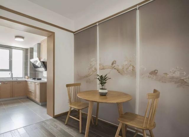 餐厅和厨房是开放式的格局。简约、线条清晰是禅意家居设计的特点,于是,这些木质的家居用品,凭借着造型简洁的特性,只是看着,也让人感觉到放松和温暖;