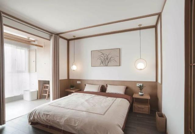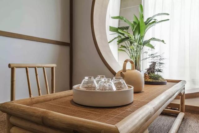 大量的自然实木家具的运用,塑造出精简造型。如同水墨画中的写意笔触,率性、洒脱,勾勒禅意空间的气韵与情致。