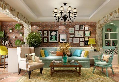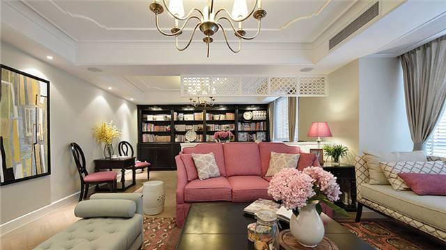 如上图所示那样,美式风格客厅中央安装的是一盏铁艺灯具,在风格上偏向美式的田园风,简约的吊灯造型又不失复古,采用白光光源使居室变得更亮堂。客厅与阳台之间用书柜吧台隔断,休闲范儿十足