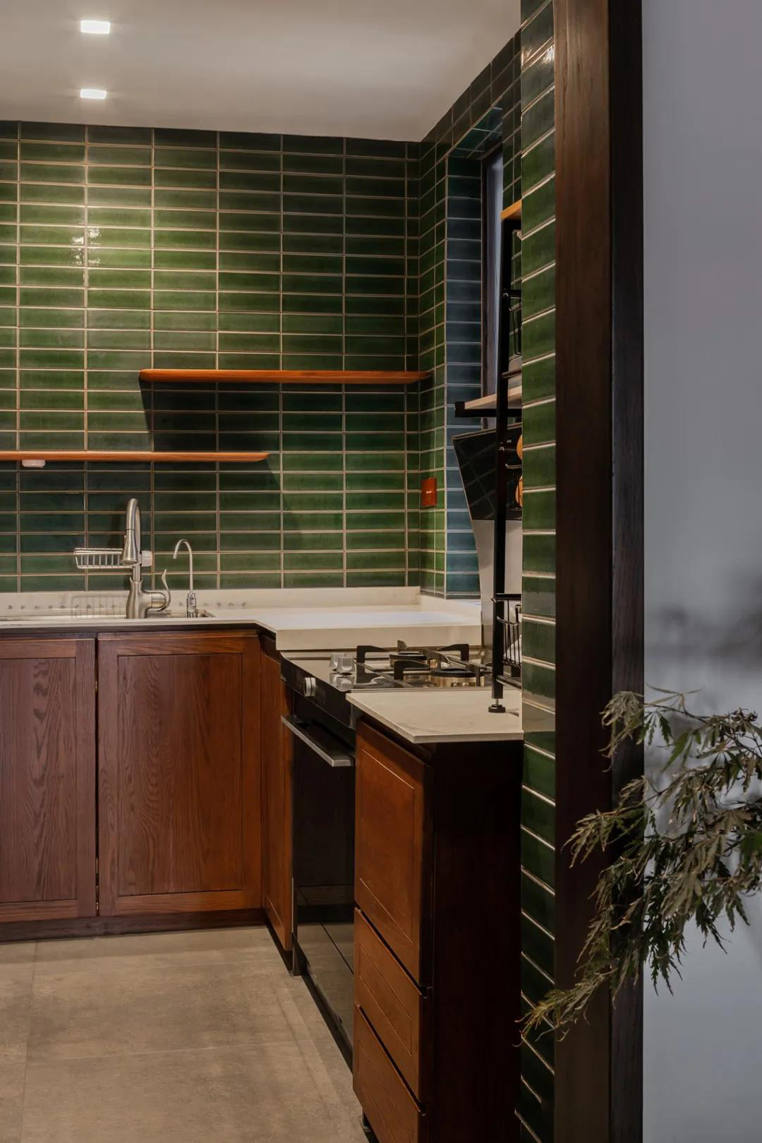 厨房木纹橱柜门搭配复古绿色墙砖,错落的台面更符合人性化设计,为了不显拥挤用置物板取代墙柜。