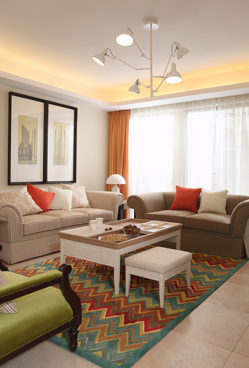 客厅采用橙色的窗帘和草绿色的地毯,加上紫色的插画装饰,春天的气息扑面而来,春意盎然,电视墙用多收纳型的实木壁柜,简单且实用,让客厅空间错落有致。