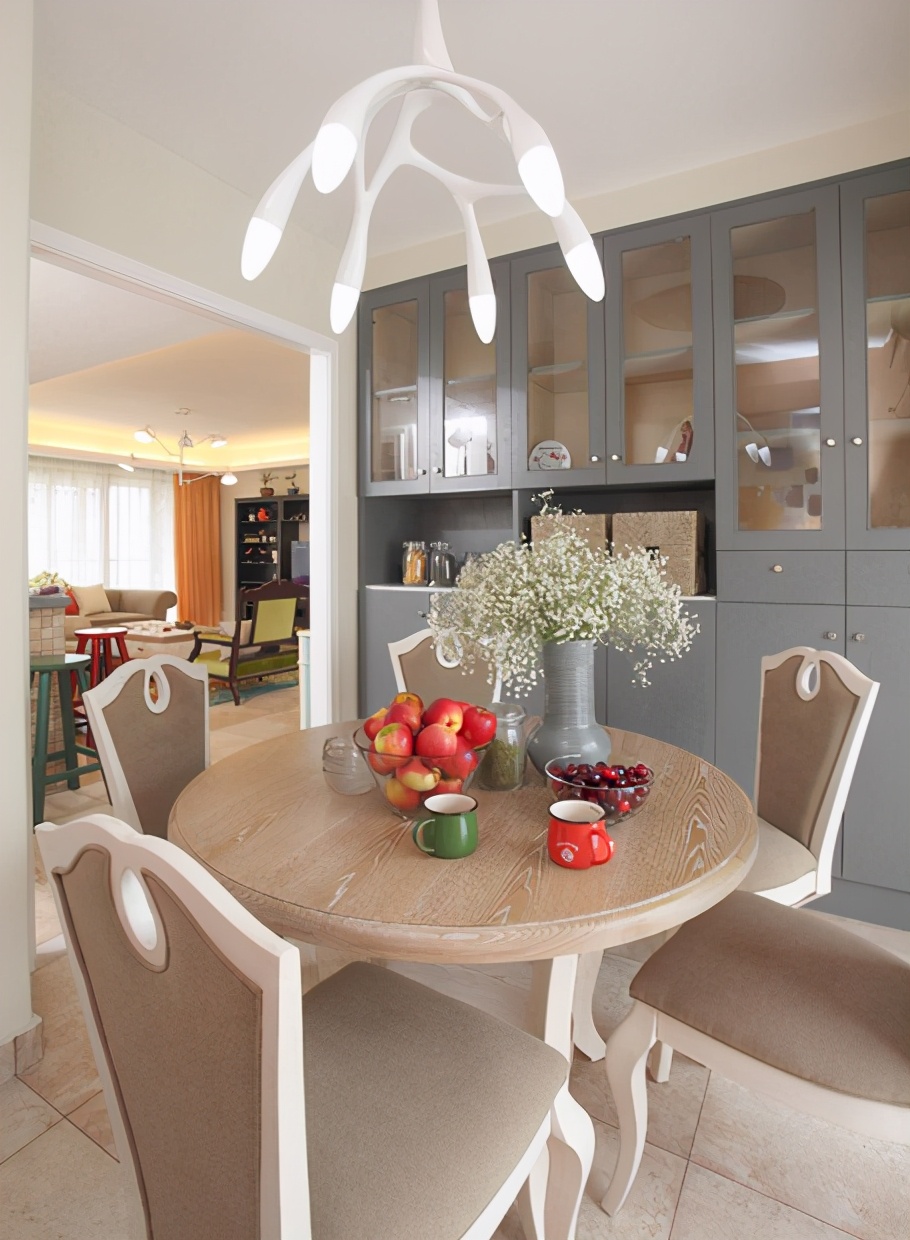 餐厅的空间有限,因此采用了圆形的小餐桌,把华丽的水晶吊灯换成个性十足的灯具,增添一些生活的乐趣,同时用一些鲜花装饰,把原本拥挤的餐厅空间显得更加有生活的气息。