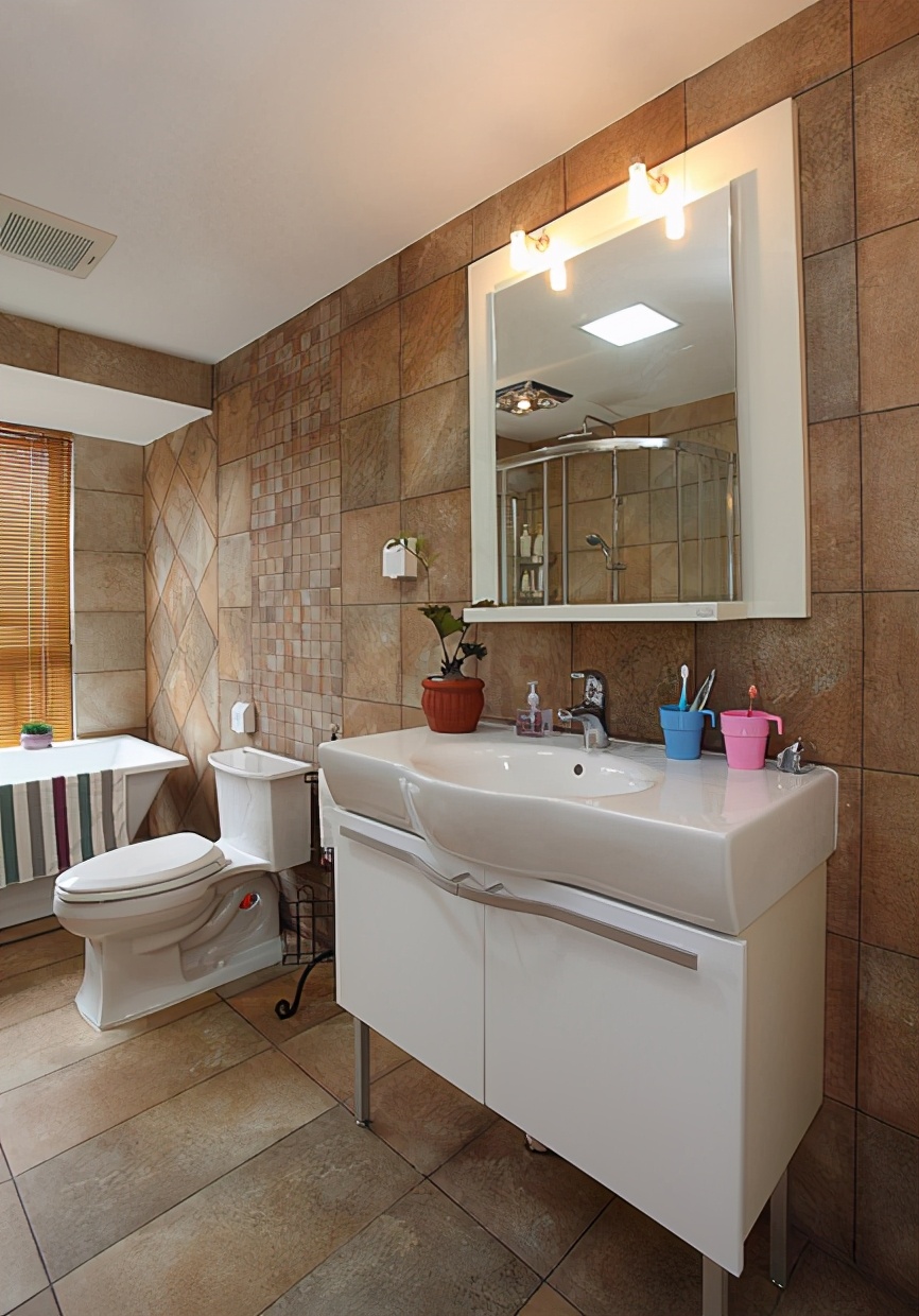 卫生间采用干湿分离的设计,让动线更加流畅一些。浴缸不仅满足了日常泡澡需求,还方便给两个孩子洗澡。百叶帘和壁龛设计,绝 对的加分项,美观实用不突兀。