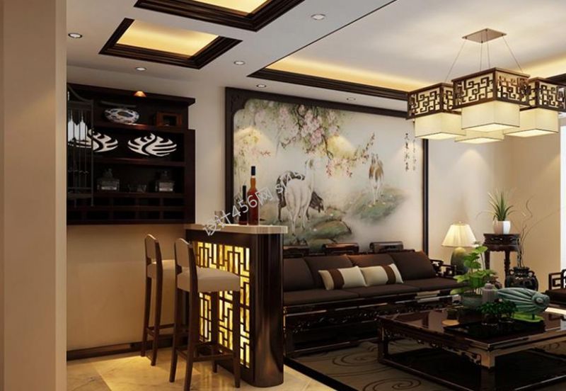 三居135平新中式风格客厅吧台设计效果图