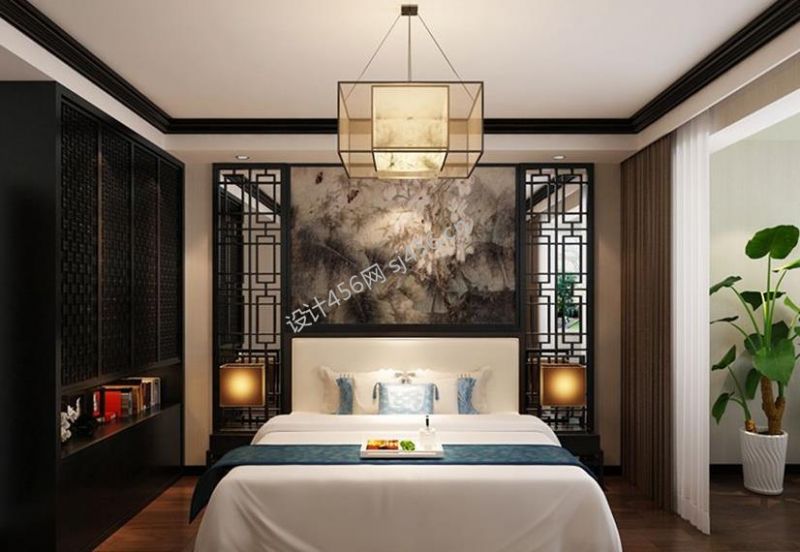 三居135平新中式风格卧室床头背景墙设计效果图