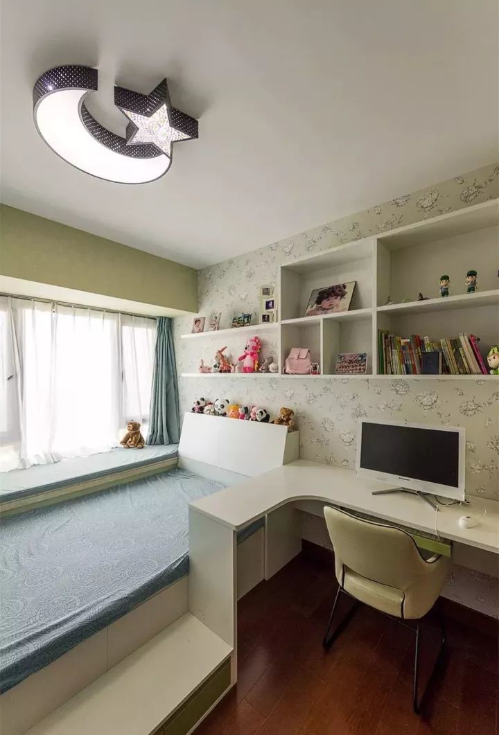 2、在榻榻米床尾也可以装个书架,紧凑的双人位书桌,结合书桌上方的高低架搁板,显得格外的美观大方;