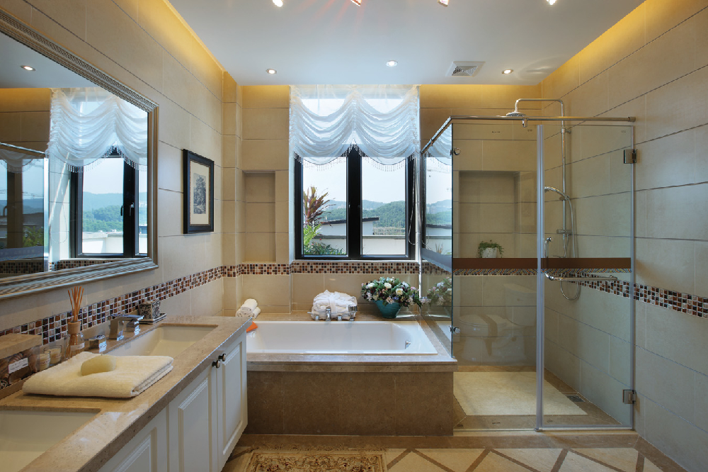 3、很多人喜欢将洗衣间摆放在客卫,这是很不可取的,因为卫生间会比较潮湿,这样有可能会造成电线短路,从而产生危险,如果一定要在卫生间里放洗衣机,要实行严格的干湿分离;主卫可以实现更多个性化的装饰,浴缸、洁身器这些提升舒适度的产品有条件装修时就装好,因为卫生间是个改动起来很麻烦的空间,一定要提前规划。对于卫生间而言,喜欢装饰的朋友可以考虑做一些皮纹砖之类的材料,可以起到软装饰的作用,卫生间一般湿区比较多,一般不建议铺贴壁纸,如果是有卫生间干区的可以考虑。