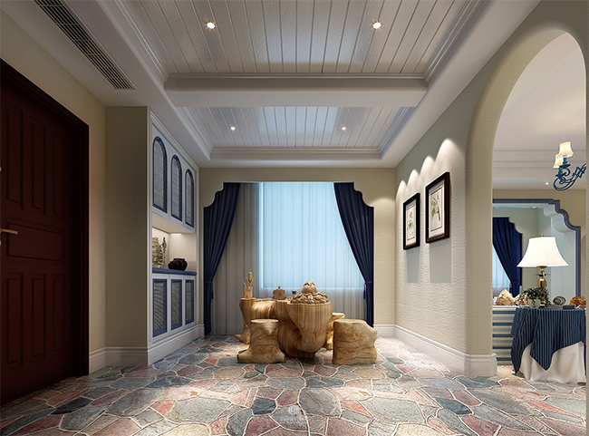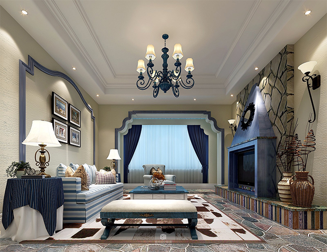 【设计说明】本案主要以蓝色,蓝色以人宁静,用于地中海风格设计,给整个空间不一样的视觉感受,让人有海的无限幻想