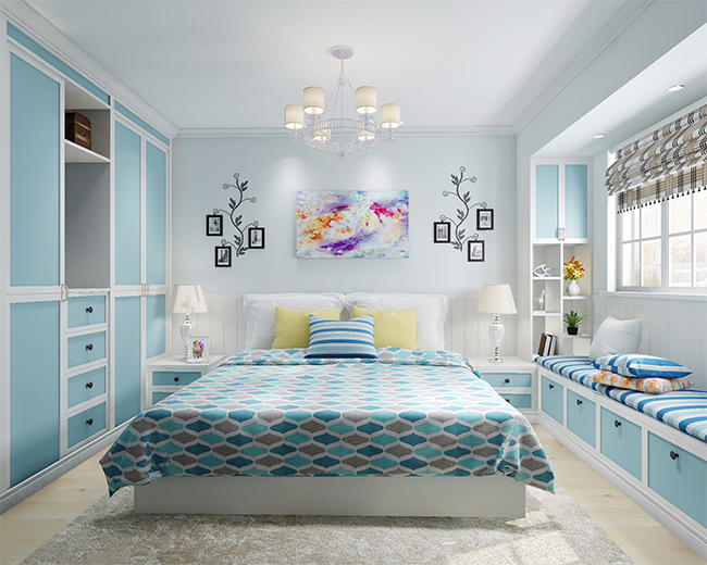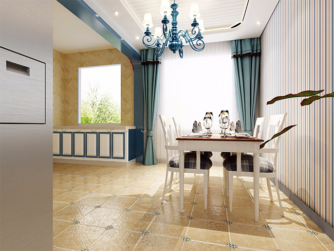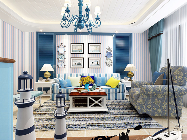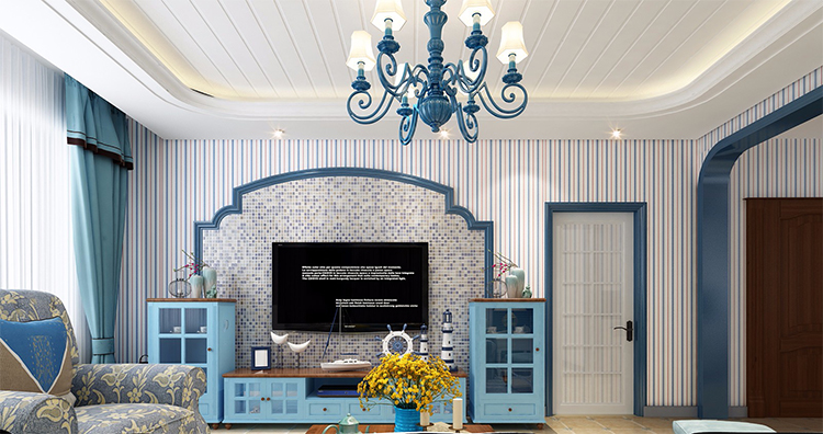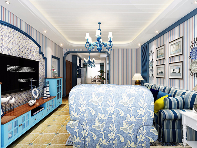 【设计说明】地中海风格的美反映在与大海,蓝天为伍,与光大自然融合的特殊风情,基调色彩是明亮,热烈和丰富的。取材样式多来自于自然,拱形形状是地中海中独有的符号,电视墙采用重复链接的方式让人的视觉享受到延伸的视觉感