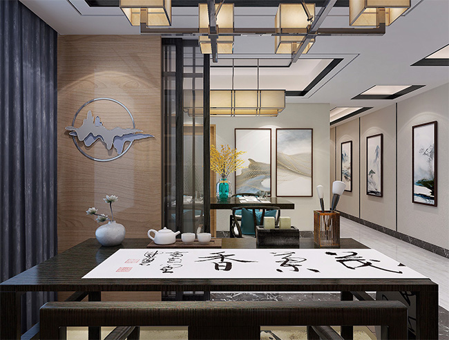 【设计说明】新中式风格非常讲究空间的层次感,在需要隔绝视线的地方,则使用中式的屏风或窗棂、中式木门、工艺隔断、简约化的中式“博古架”,通过这种新的分隔方式,单元式住宅就展现出中式家居的层次之美。再以一些简约的造型为基础,添加了中式元素,使整体空间感觉更加丰富,大而不空、厚而不重,有格调又不显压抑