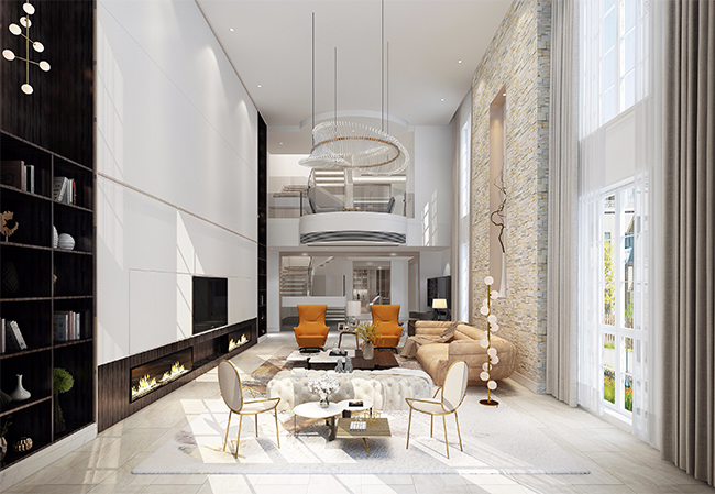 【设计说明】自建房,两层,为楼中楼,共430平,风格上以时尚。现代简约为主题,使整体空间舒适明亮