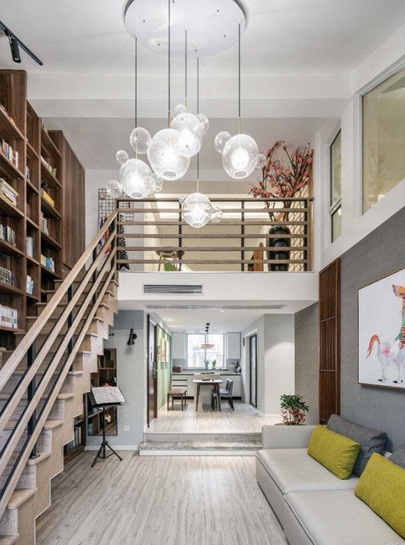 这是一套狭长型的复式空间,整体采用现代风格来设计,利用楼梯一侧的墙面设置了满墙的书柜,亮丽的配色设计,营造出的时尚空间让人眼前一亮!面积不大的复式户型,收纳空间的设置显得至关重要,长长的楼梯依墙而建,一侧的墙面利用胡桃色板材定制了满墙的书柜,充分利用现有空间提升家中的收纳能力。下面就一起来看看这套收纳空间设计很充足的现代风格复式装修案例!
