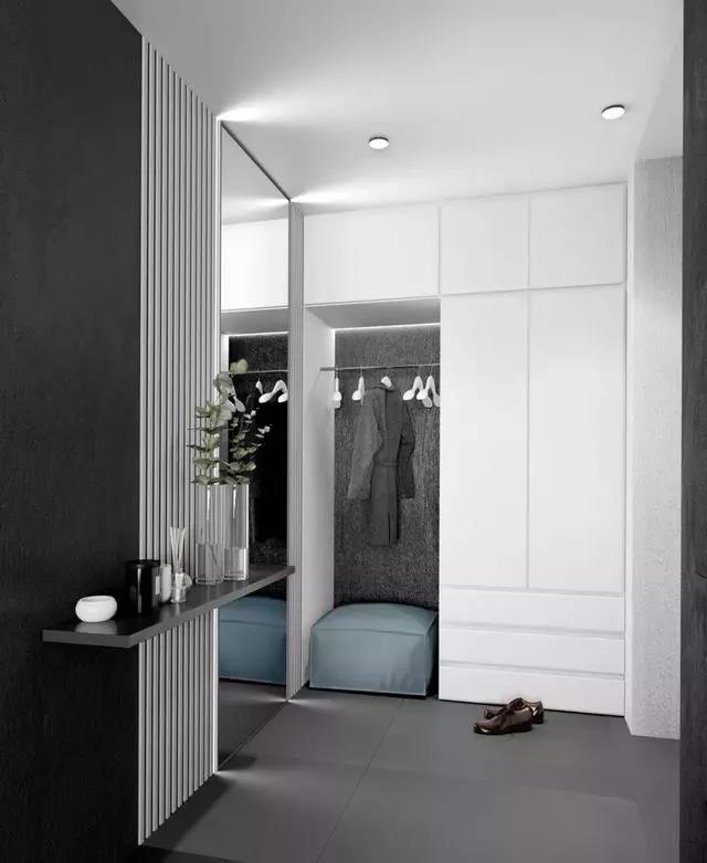 有的人会有这样的一个习惯,那就是一到家就会换上家居服,又或者找出第二天要穿的衣服,这样第二天就没必要手忙脚乱了,因此我们的玄关也可以是一个很不错衣帽间,不仅装饰效果好,另外还能收纳。