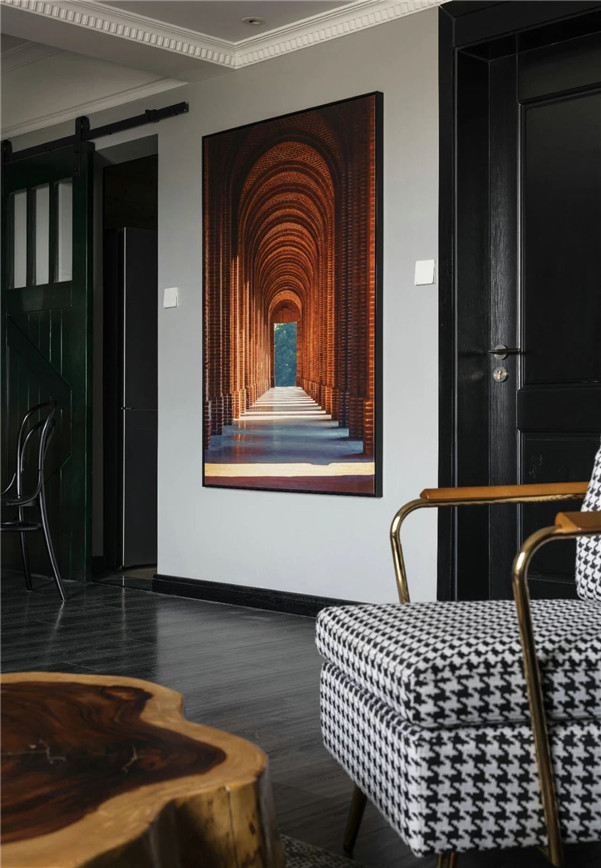 客餐厅延续暖色老木板元素,整个空间采用了质朴的棕色,红色同色系作为辅助色,墙面采用灰色为主调,转换空间画面的同时,随着光影变化,让空间更具沉稳,过道处充满艺术气息的挂画,更给空间带来了艺术气息。
