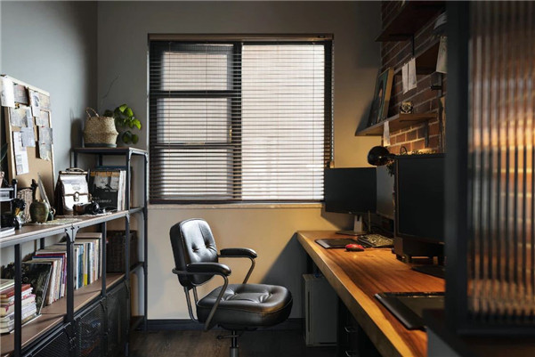 书房采用大面积红色文化石作为背景,为做动画设计专业的业主带来工作的激情,同时暖色灯光与自然光线的介入,斑驳凹凸的文化石更具立体感,怀旧情怀映入眼帘。以长虹玻璃作为半隔断,光影与色彩透过玻璃若隐若现,书房与客厅形成情感沟通与互动。