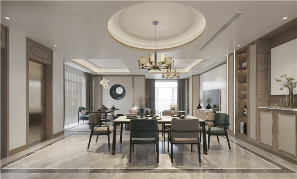 客厅家具线条简约流畅,不同材质的运用和碰撞,凸显新中式风格特有的质感和美感。中式元素点缀其中,巧妙地融入吊灯、茶几等家具,赋予空间隐约悠远的意境。