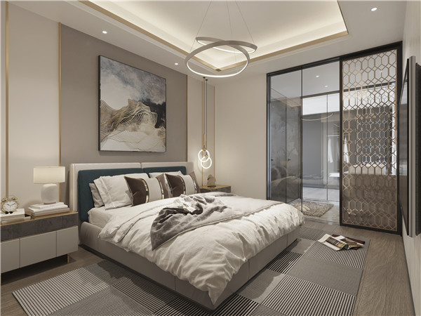 主卧整体氛围淡雅而不失厚重,在追求精致内涵的同时,注重空间居住的舒适度和实用性。主卧选用白与浅棕作为主色系,沉稳内敛,床头背景选择一幅山水画与房屋整体风格风格统一,给人一种宁静而又温馨的感觉。
