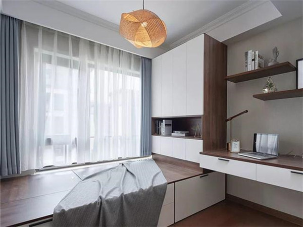次卧的面积比较小,采用了榻榻米的装修方案,这种一体化的设计能够为室内节省不少的空间,从而让卧室显得更加宽敞舒适。书桌采用壁挂的安装方式,在墙壁上还安装了精致的隔板,能够摆放一些书籍和装饰品,使得室内显得更加时尚有立体感。