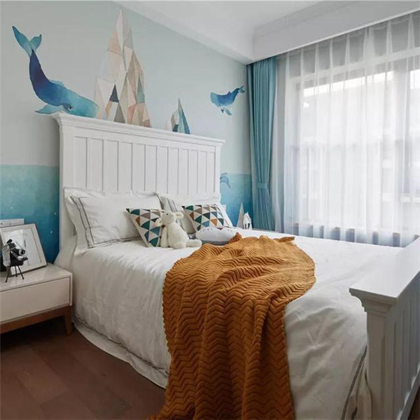 还有一间小卧室床头背景墙上装饰了一组大海图案的壁画,搭配一张精致的大床,显得格调感十足。在卧室还设计了一面大尺寸的落地窗,躺在大床上透过窗户就能看到外面美丽的景色,让人感觉更加轻松舒适。