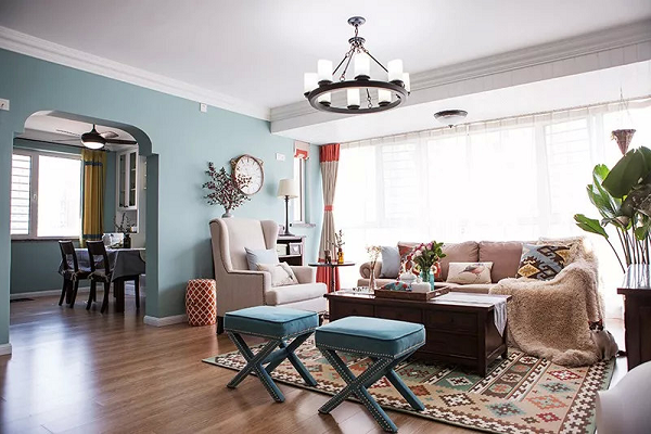 这套120㎡美式三居室整体设计清新大气,淡蓝色墙面搭配白色天花板、门窗,让人眼前一亮;室内还用了很多经典的拱门设计,充满浓浓的美式风情!