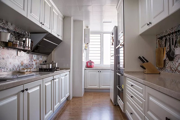 厨房装了U型橱柜,墙上还装了吊柜,储物空间丰富。